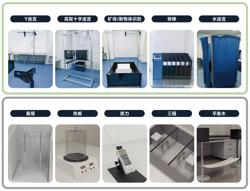 赛业生物大小鼠神经行为学平台配备专属水迷宫、Y迷宫、转棒、旷场、高架十字迷宫等多类型实验仪器设备,可开展学习记忆类、运动平衡类、精神情绪类和社会群体类等多种行为学实验服务。