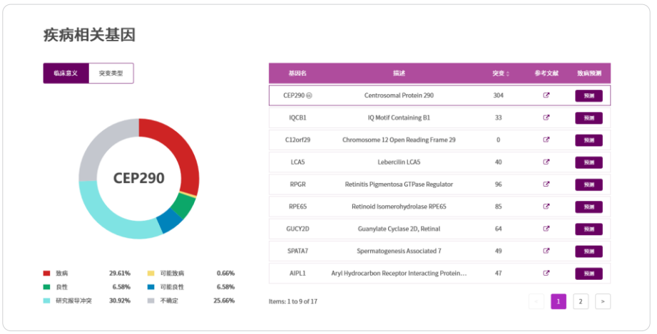 在RDDC中检索Leber先天性黑蒙症10型致病基因CEP290可得到该基因序列同源性、基因组信息、CEP290临床突 变、转录本、相关疾病、涉及表型及基因表达水平等相关信息。