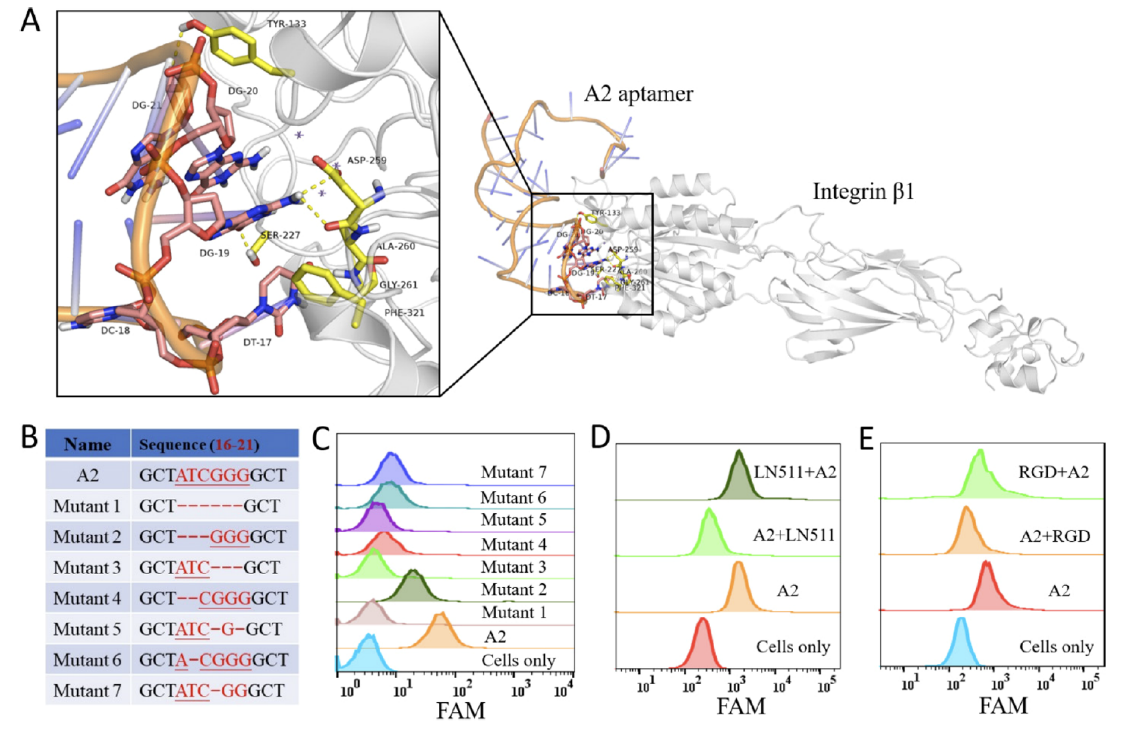 利用流式细胞术初步验证出核酸适配体A2与靶细胞结合的靶标为蛋白质,利用Pull-down实验及质谱技术(由吉凯基因提供技术服务)、基因敲低实验进一步验证出A2结合靶标为Integrin β1。 此外,通过分子对接技术准确地预测出A2与Integrin β1的具体结合位点。