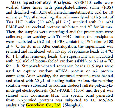 本研究使用质谱检测核酸适配体A2结合的目标蛋白,由吉凯基因提供技术服务。