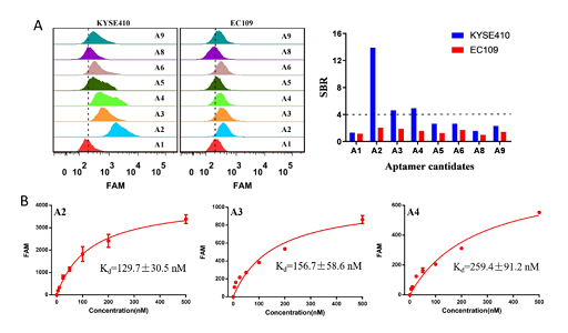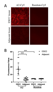 在该研究中,研究团队通过Cell-SELEX技术筛选出可以特异性识别ESCC细胞系的核酸适配体,且通过组织成像证明核酸适配体 A2可识别病人食管鳞癌组织。