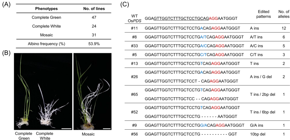 本研究针对组成型启动子(如CaMV 35S和泛素启动子)在作物基因组编辑中易导致脱靶效应和发育异常的问题,探索了水稻内源核糖体蛋白S5(OsRPS5)启动子的替代潜力。通过构建OsRPS5-H1/H2驱动SpCas9的编辑系统,在原生质体和转基因水稻中靶向OsPDS与OsBADH2基因,证实OsRPS5-H1编辑效率与组成型启动子相当,且50%转基因株系呈现OsPDS敲除的白化表型。该启动子为单子叶作物提供了更精准、高效的编辑工具,对作物精准育种具有重要意义。