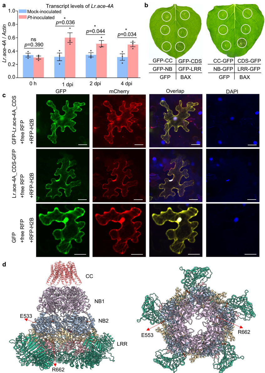 本研究针对小麦叶锈病的严重威胁,通过构建高质量硬粒小麦参考基因组结合EMS诱变和转录组测序,成功克隆了位于染色体4A重组稀疏区的抗病基因Lr.ace-4A,并证实其与六倍体小麦中已知的Lr30基因为同一基因。该基因编码具有串联NB-ARC结构域的非典型NLR受体,在四倍体小麦中表现出近乎免疫的抗性,但在六倍体背景下效果减弱。研究还开发了特异性分子标记,为小麦抗病育种提供了重要资源。