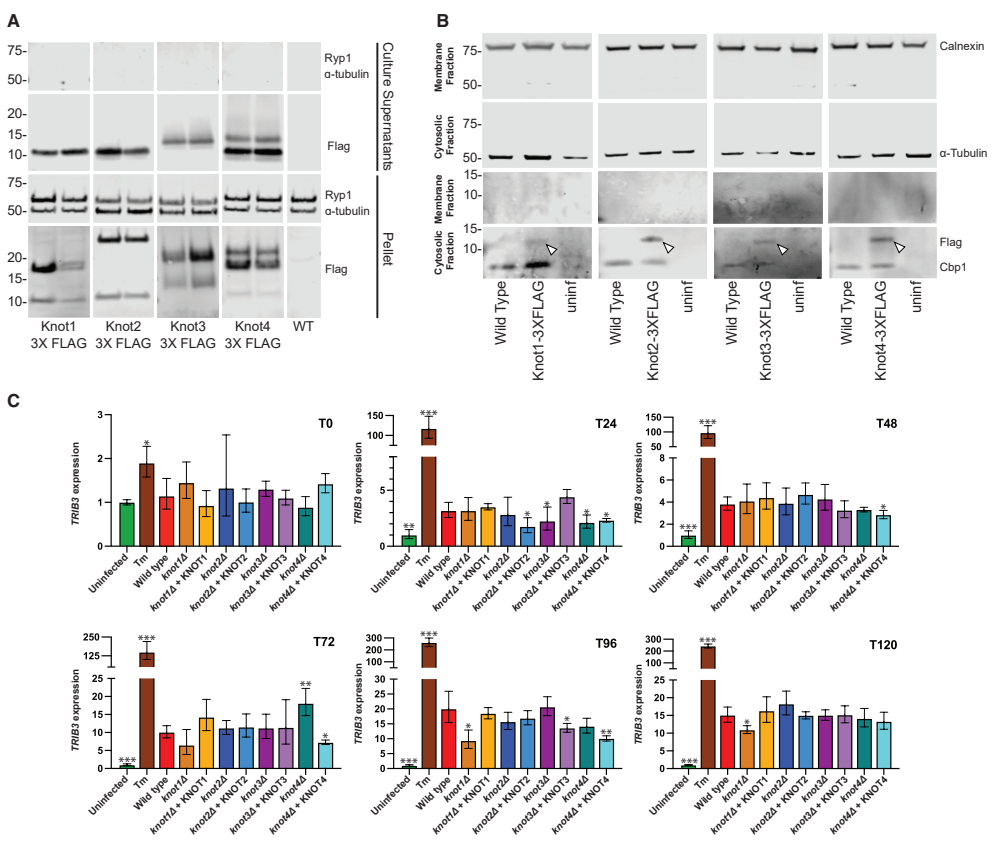 本研究针对人类真菌病原体组织胞浆菌(Histoplasma)效应因子鉴定难题,研究人员通过生物信息学分析开展毒力因子发现研究,成功鉴定出25个knottin蛋白的显著扩张。功能研究表明KNOT1-4在巨噬细胞内生存和宿主细胞裂解中起关键作用,其中KNOT2和KNOT4对小鼠体内毒力至关重要。该研究不仅揭示了knottin蛋白在真菌致病中的新机制,还开发了KNOTTIN_FINDER和KNOTTIN_TOPOLOGY_SCAN算法,为其他病原体效应因子发现提供了通用工具。