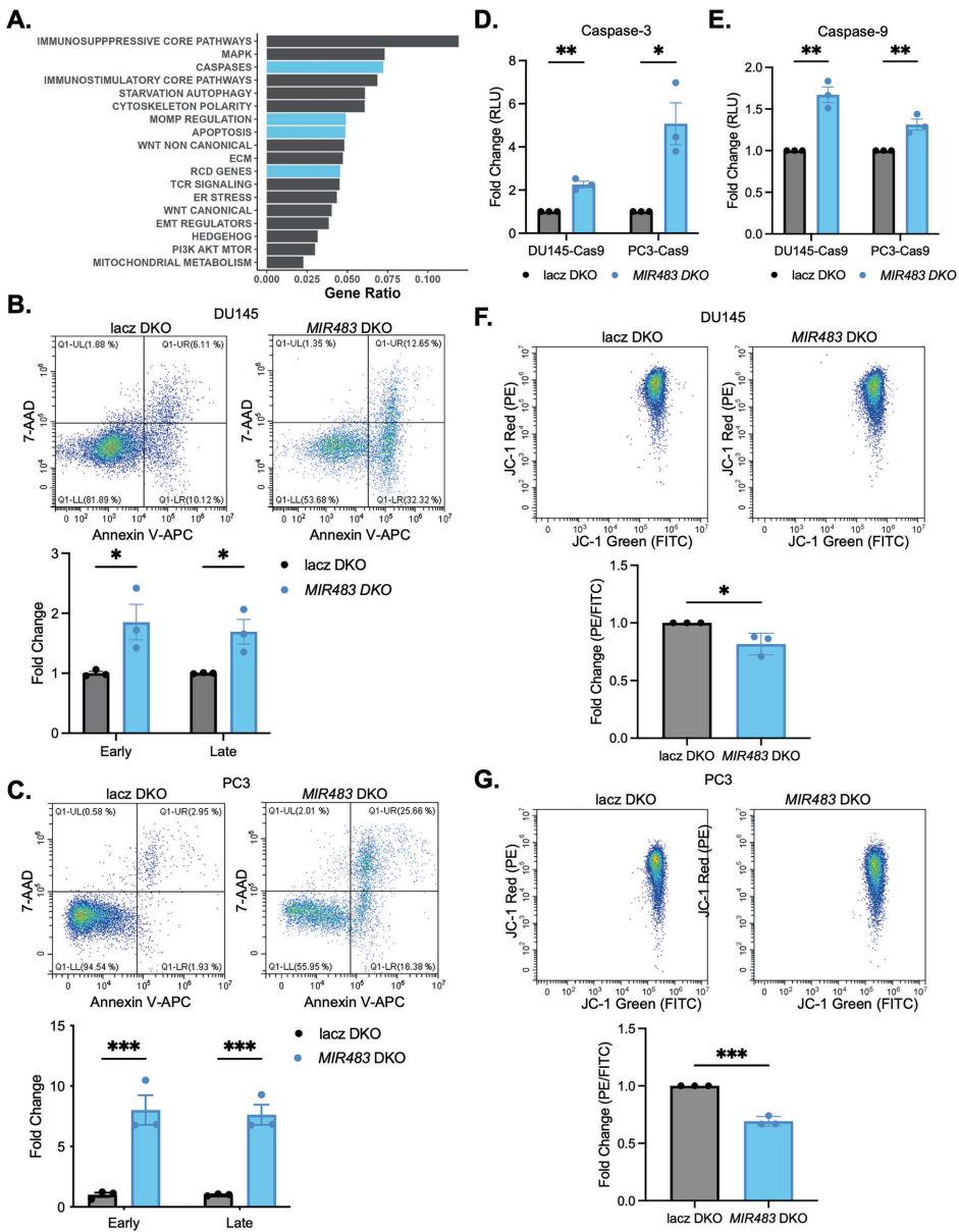 本研究针对前列腺癌(PCa)治疗中凋亡逃逸的临床挑战,开发了新一代miRNA专用CRISPR敲除库miRKOv2,通过全基因组功能缺失筛选发现miR-483-3p是维持PCa细胞存活的关键调控因子。机制研究揭示miR-483-3p通过直接靶向BCLAF1/PUMA/BAK1凋亡信号网络抑制内在凋亡通路,其抑制剂与多西他赛(DTX)联用可显著增强化疗效果。该研究为转移性PCa提供了新的治疗策略,发表于《Cell Death and Disease》(2025)。