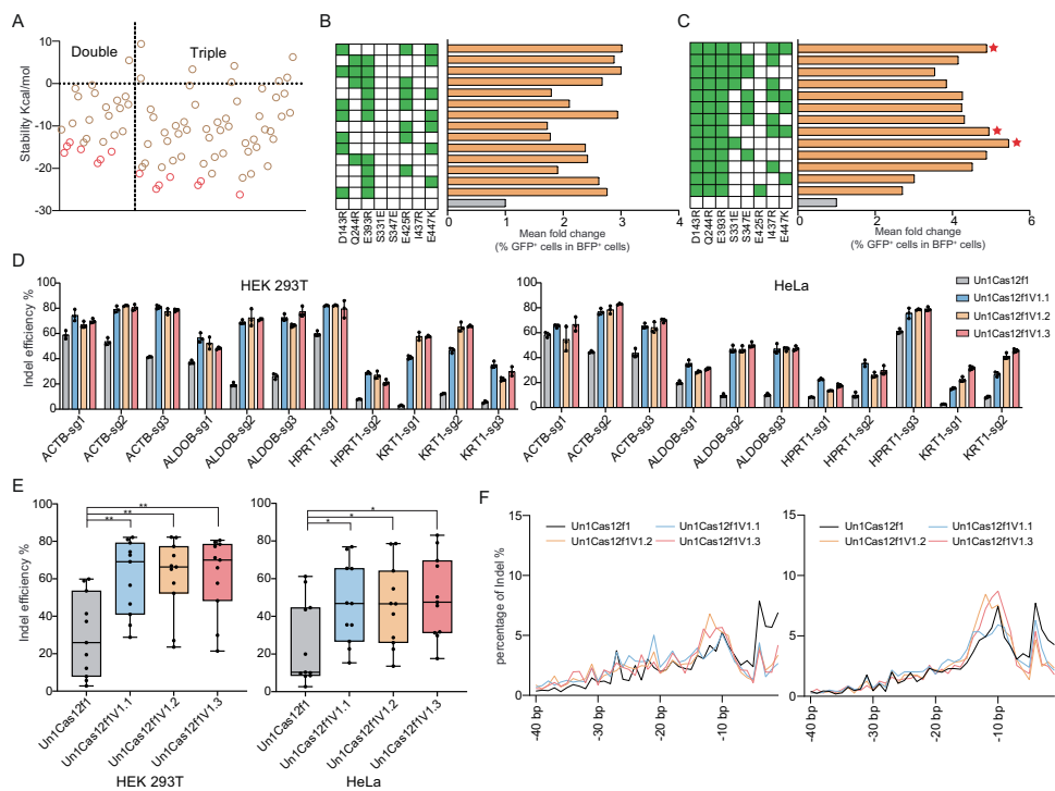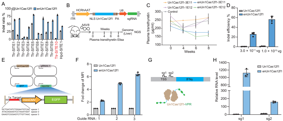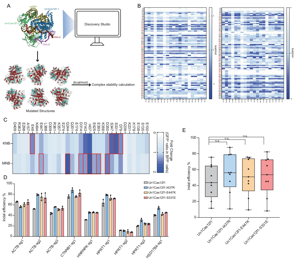 本研究针对微型碱基编辑器开发难题,通过计算建模和定点突变技术成功构建高活性enUn1Cas12f1蛋白,并意外发现其具备靶链(TS)编辑能力。研究人员进一步通过丙氨酸扫描筛选获得偏好性TS编辑的切口酶-CBE(TSminiCBE),结合非特异性DNA结合结构域优化后实现在体高效编辑。该研究创建了链选择型微型CBE工具包,为基因治疗提供了新策略。