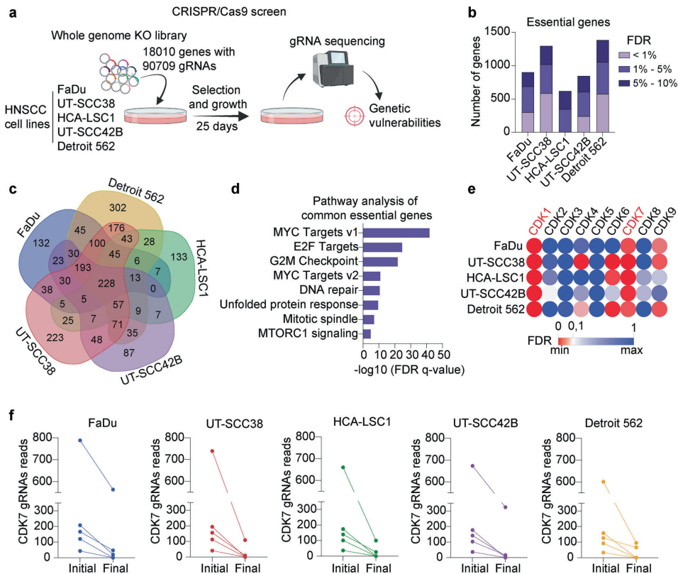 本研究针对头颈鳞状细胞癌(HNSCC)缺乏有效靶向治疗的临床困境,通过全基因组CRISPR筛选发现CDK7是关键治疗靶点。研究人员采用基因敲除和选择性抑制剂(YKL-5-124/samuraciclib)证实CDK7抑制能显著抑制HNSCC细胞增殖,诱导细胞周期阻滞和凋亡,并在患者来源类器官(PDO)和异种移植(PDX)模型中验证其抗肿瘤活性。该研究为HNSCC提供了新的治疗策略,支持CDK7抑制剂进入临床转化。