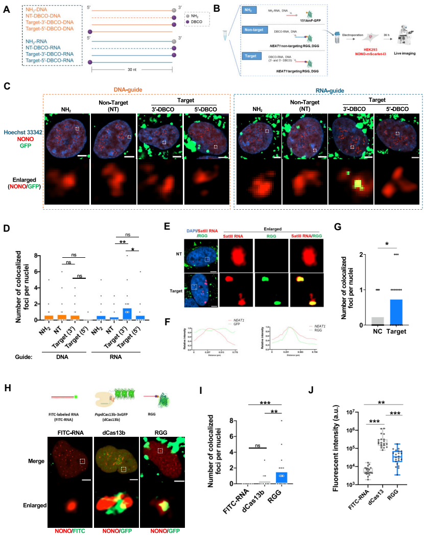 本研究针对活细胞RNA成像技术存在的遗传操作复杂、分子尺寸大、潜在干扰强等瓶颈,开发了一种新型RNA引导绿色荧光蛋白(RGG)平台。研究人员通过点击化学将DBCO修饰的向导RNA与叠氮化GFP高效偶联,实现了NEAT1和SatIII等核内RNA的可视化。该技术具有程序化设计、分子紧凑、无需基因改造等优势,为RNA动态研究提供了强大工具。