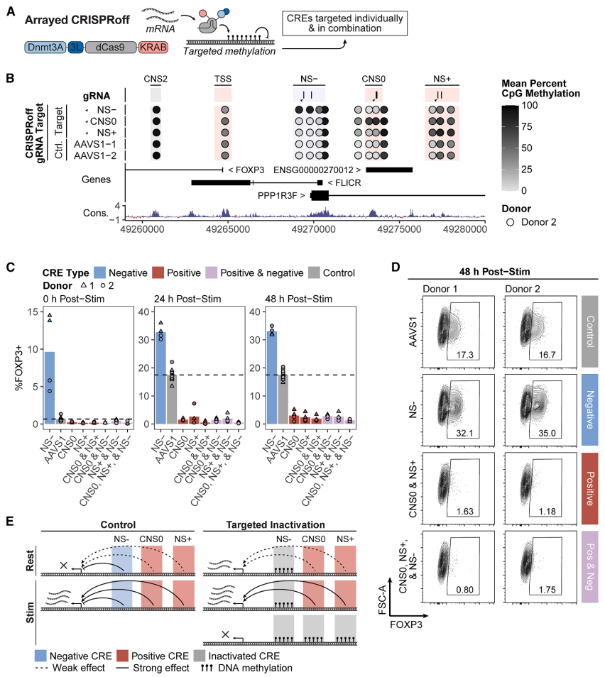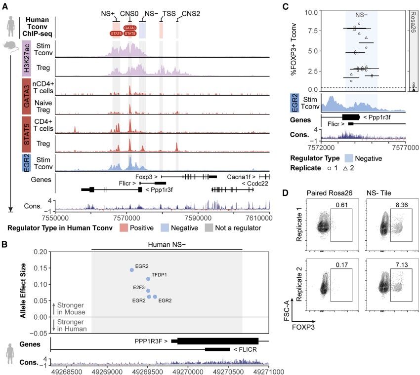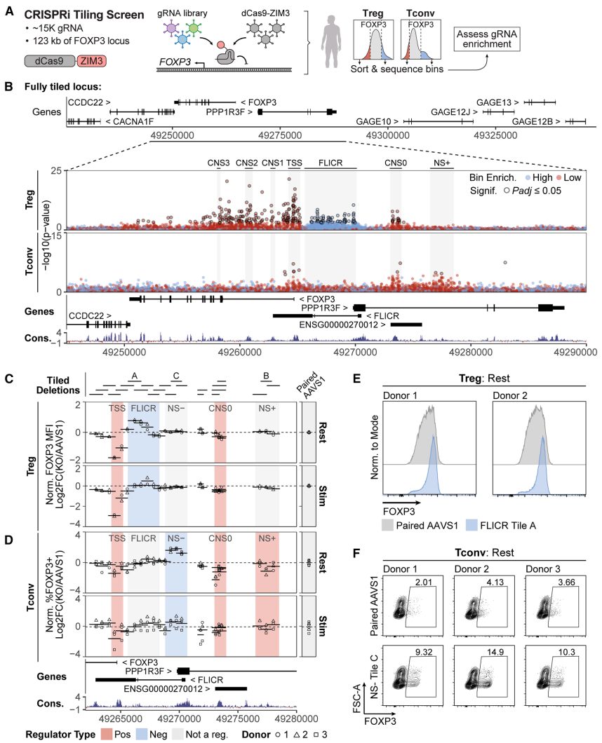 本研究通过CRISPR筛选技术系统解析了人Treg和Tconv细胞中FOXP3表达的调控机制,发现CNS0、NS+等增强子元件和NS-沉默子元件协同控制FOXP3的细胞特异性表达,并鉴定出GATA3、STAT5等关键转录因子。该研究揭示了物种间FOXP3表达差异的分子基础,为自身免疫病治疗提供了新靶点。