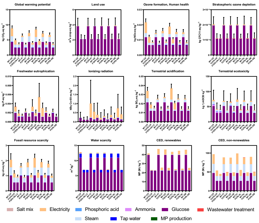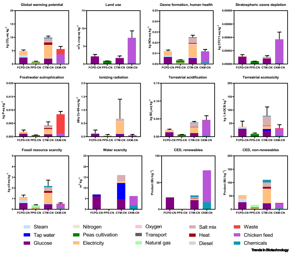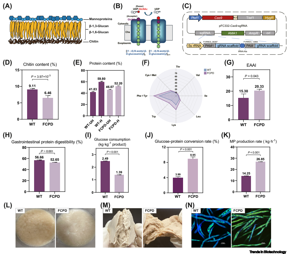 本研究针对传统真菌蛋白营养效价低、底物转化率不足及环境负担较重等问题,通过CRISPR/Cas9介导的无疤痕基因敲除技术对Fusarium venenatum进行代谢工程改造。研究成功构建了FCPD工程菌株,其必需氨基酸指数(EAAI)提升32.9%,底物消耗降低44.3%,蛋白质转化率提高至野生型的2.24倍。基于工业规模数据的生命周期评估(LCA)显示,在六国生产情景下FCPD可降低全球变暖潜能(GWP)4-61.3%,且环境表现优于细胞培养肉与鸡肉。该工作为基因编辑技术同步提升替代蛋白营养价值与环境可持续性提供了实证。