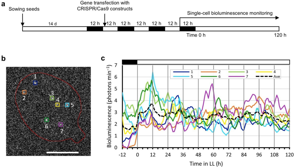 本研究针对植物单细胞基因表达分析中传统荧光报告系统存在光损伤、背景干扰及报告基因拷贝数异质性大等问题,开发了一种基于CRISPR/Cas9诱导生物发光恢复的报告系统(CiRBS)。通过将失活的荧光素酶突变体LUC40Ins26bp整合至拟南芥基因组,并利用粒子轰击转染CRISPR/Cas9元件,成功在单细胞水平实现长期稳定的基因表达监测。该系统显著降低了细胞间比较的偏差,为揭示植物细胞自主性节律及基因表达噪声提供了可靠工具。