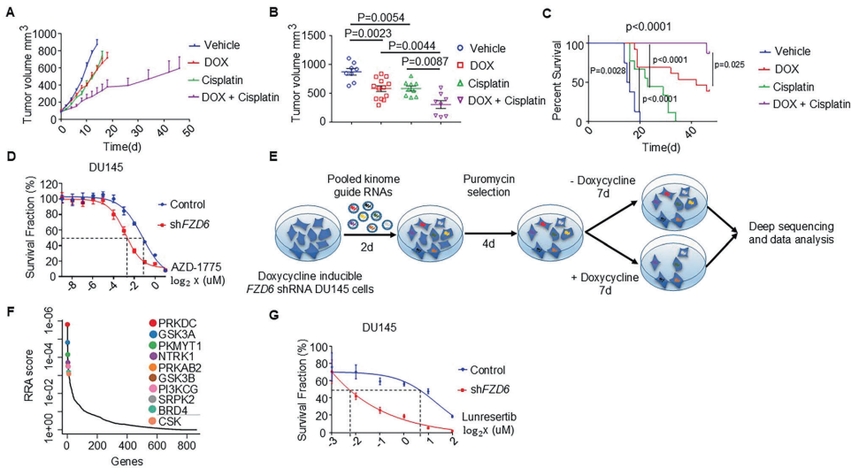 本研究针对晚期前列腺癌缺乏有效治疗手段的难题,聚焦Wnt信号通路中的FZD6受体。研究人员发现FZD6在晚期前列腺癌中高表达且频繁扩增,通过体外和体内实验证实敲低FZD6可抑制肿瘤生长,并揭示其通过PLK1-WEE1轴破坏DNA双链断裂修复机制。研究还发现FZD6抑制可增强顺铂疗效,并通过激酶组CRISPR筛选鉴定出PKMYT1抑制剂lunresertib的协同作用,为晚期前列腺癌提供了新的联合治疗策略。