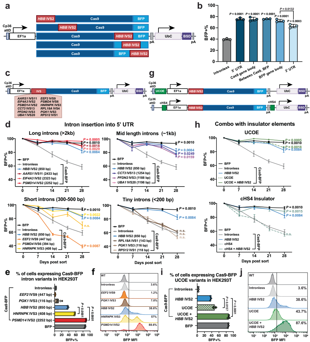 本研究针对外源基因(尤其是Cas9)在哺乳动物细胞中易被表观沉默的技术瓶颈,通过系统性地在表达框架中引入内含子序列,显著提升了转基因的长期稳定性。实验表明,长度超过2 kb且富含T碱基的内含子(如HBB IVS2)与染色质开放元件(UCOE)协同作用,可同时从RNA和DNA层面抑制HUSH复合物介导的沉默机制。该策略成功增强了CRISPRa/dCas9系统对内源基因(如CD2、CD14、CD28)的激活效率,为基因治疗和合成生物学提供了普适性优化方案。