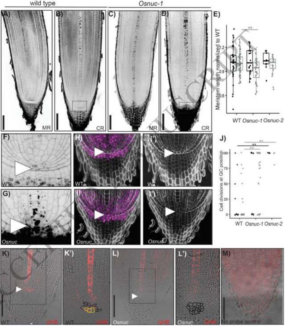 本研究针对水稻根尖分生组织中细胞分裂调控机制不清的问题,通过CRISPR/Cas9基因编辑技术构建OsBIRD/IDD家族基因突变体,发现OsNUC通过与OsSHR1、OsSCR1形成蛋白复合物,调控OsQHB/WOX5表达,从而维持静止中心(QC)特性并限制皮层细胞分裂。该研究揭示了单子叶植物中BIRD蛋白功能的新机制,为作物根系改良提供了理论依据。