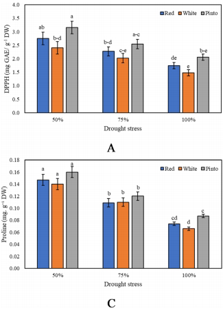 斑豆的抗氧化能力显著占优:50%灌溉时其DPPH自由基清除率比对照提高62%,CAT活性增强77%,同时MDA含量(氧化损伤标志物)仅上升78%,远低于白豆的83%。脯氨酸作为渗透调节物质,在斑豆中积累量较对照提升112%,帮助维持细胞膨压。
