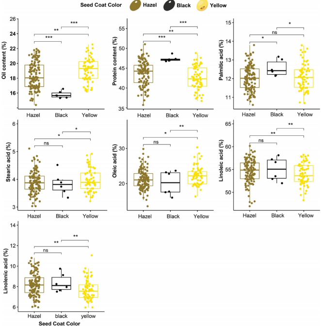 大豆(Glycine max)作为全球最重要的油料作物之一,其种子蛋白质和油脂含量直接影响营养价值和工业用途。然而,种子物理特性(如颜色和重量)与生化成分的关联机制长期存在认知空白,特别是在不同成熟度组(Maturity Groups, MGs)中的表现规律更鲜有系统研究。当前育种面临三大挑战:高蛋白与高油脂含量的负相关关系、脂肪酸组成调控的复杂性,以及表型标记筛选体系的缺乏。