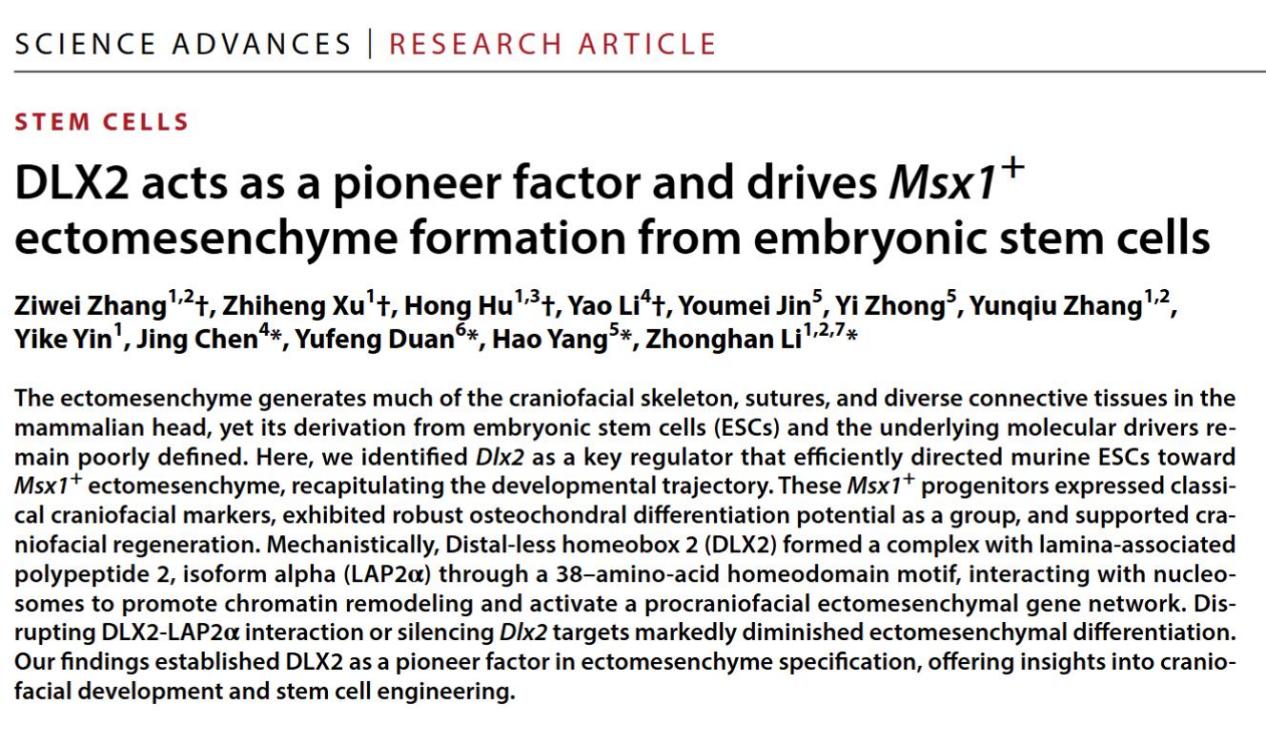 2026年1月14日,四川大学李中瀚教授团队与上海交通大学医学院附属第九人民医院段余峰主治医师、四川大学华西医院杨浩研究员和陈静研究员在《Science Advances》联合发表题为“DLX2 acts as a pioneer factor and drives Msx1+ ectomesenchyme formation from embryonic stem cells”的重要研究成果