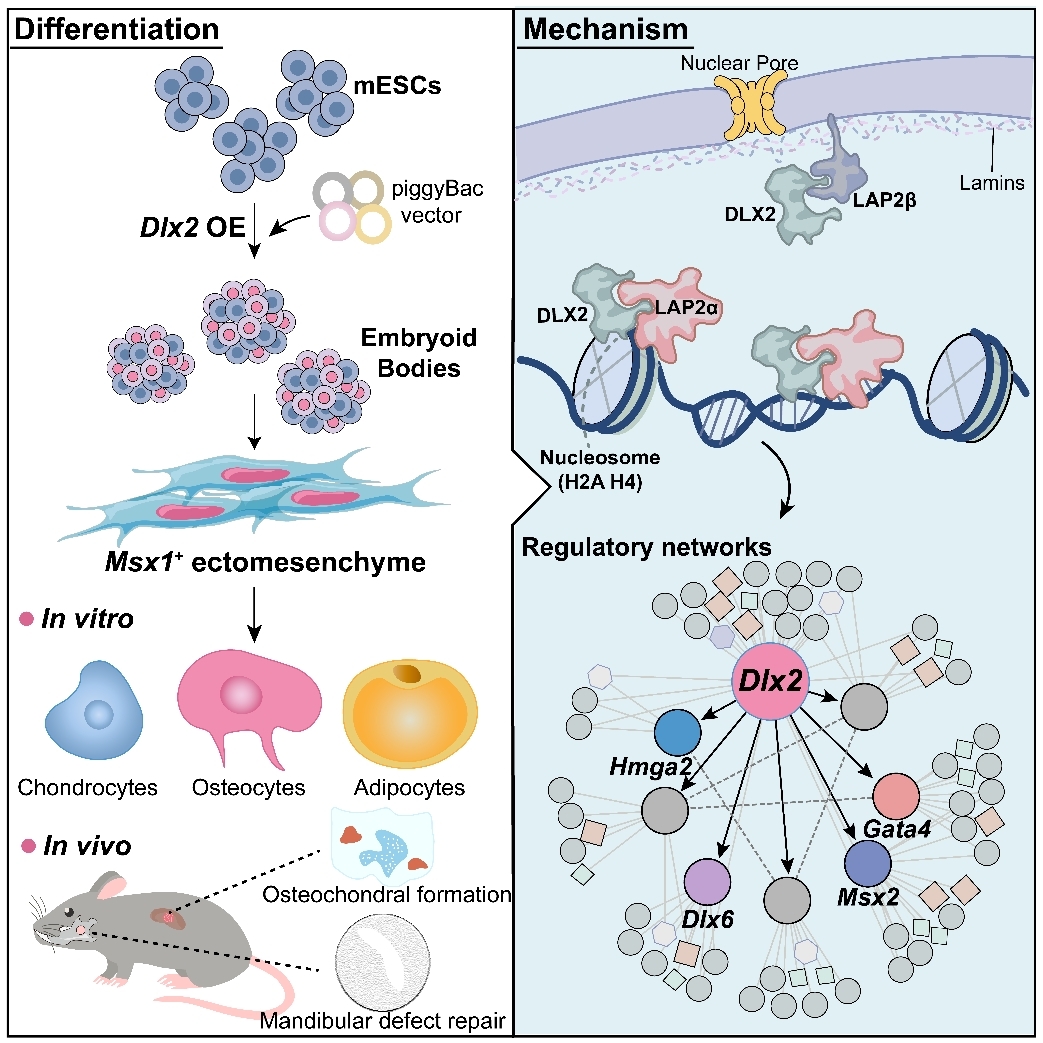外胚间质谱系在哺乳动物头部形成中发挥关键作用,不仅是牙齿的祖细胞谱系,也生成大部分颅面骨骼、颅缝以及多样化的结缔组织。然而该谱系如何从胚胎干细胞(ESCs)中被精确诱导,其中的关键分子驱动机制仍未明确。DLX(Distal-less homeobox)基因家族在颅面发育中高度保守,参与调控外胚间质谱系的模式化和分化,但其是否能够直接驱动ESCs向该谱系命运分化,以及相关的核内调控机制尚不清楚。