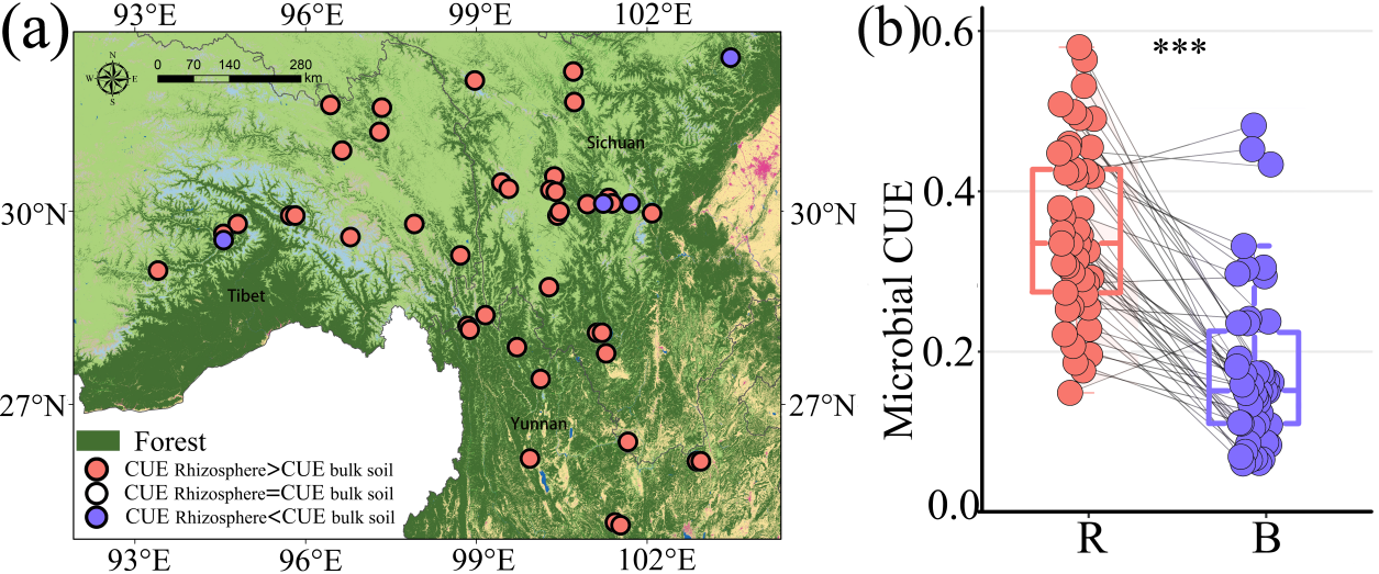 土壤碳封存是缓解气候变化、提高森林生产力以及维持生态系统稳定性的关键过程。作为最大的陆地碳库,土壤大约储存了全球碳总量的三分之二,其封存碳的能力对大气中的二氧化碳浓度有显著影响,并在调节全球变暖的轨迹方面发挥着关键作用。微生物作为土壤碳循环的重要动力,其碳利用效率(CUE)决定了微生物代谢过程中碳分配到生物量的比例以及其碳封存潜力。具有丰富高质量植物碳源持续输入的土壤微生物热点区(如根际)往往具有更高的微生物代谢活性,同时也很可能呈现出更高的微生物CUE。尽管先前的研究初步表明,根际通过提高微生物的CUE以及随后形成微生物残体碳的方式促进了土壤有机碳(SOC)的积累和稳定,但这些发现主要基于单样点研究,目前仍缺乏专门研究来解决关于根际微生物CUE是否更高的这一关键科学问题,尤其是在区域尺度上。填补这些知识空白不仅将改善根-土壤系统中微生物碳固存能力的预测,还将为在环境变化下增加土壤碳固存的潜在策略提供理论指导。