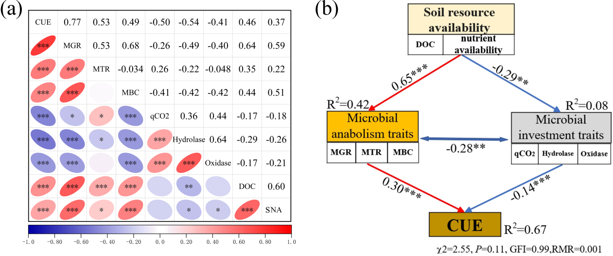 图2 微生物CUE与微生物合成代谢性状、投资性状、DOC和养分有效性之间的Pearson相关系数矩阵(a)。结构方程模型(SEM)显示土壤资源有效性如何影响微生物CUE (b)。