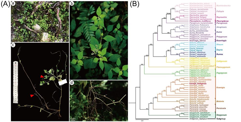图?2.?墨脱冰岛蓼?(A)生境和植株图,红色箭头指向为珠芽位置。(B)基于叶绿体DNA片段(matK、rbcL和trnL-F)联合数据集构建的系统发育树。