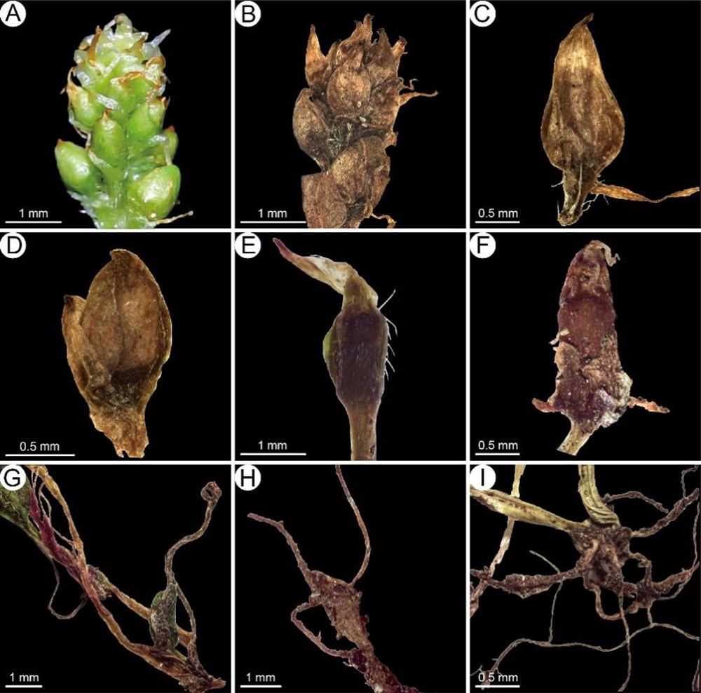 图?3?. 墨脱冰岛蓼的珠芽结构 A-D花序顶端的珠芽;E-I匍匐茎顶端珠芽的生根过程(不同发育阶段)。