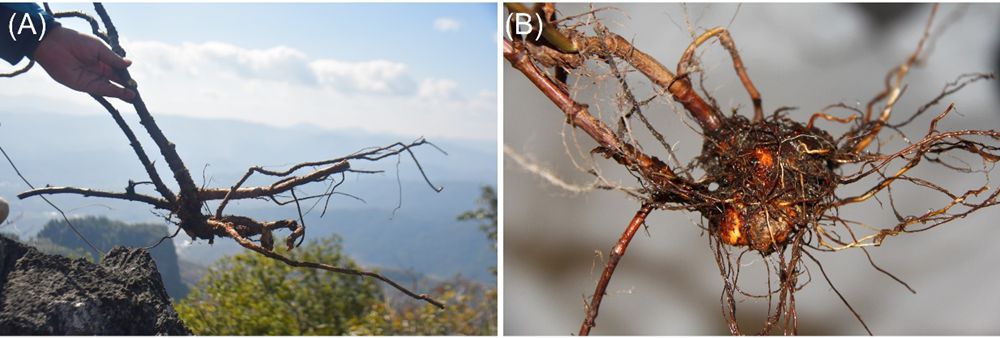 图?4.?石灰山野荞麦和金荞麦的形态特征区别 (A)石灰山野荞麦宿存的木质化根和茎基的形态特征。(B)金荞麦的地下球茎形态特征。