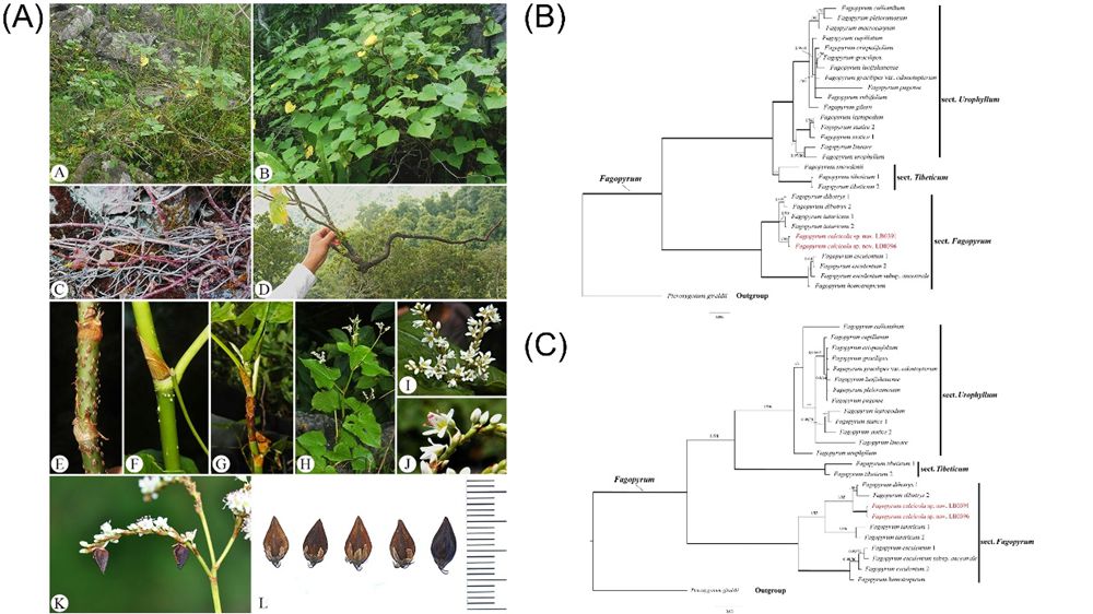 图?5.?石灰山野荞麦 (A)形态特征?A生境;B植株整体;C地上茎;D地下根;E具皮孔的成熟茎;F托叶鞘及部分茎与叶柄;G幼茎;H复合总状花序;I总状花序;J花;K具花果的花序;L瘦果。(B)基于叶绿体DNA片段(accD、matK、rbcL、psbA-trnH和trnL-F)联合数据集构建的系统发育树。(C)基于nrITS数据集构建的系统发育树。