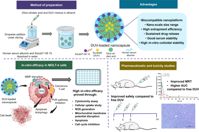 纳米胶囊系统(DUV-NCs)通过优化包封效率(86.99±1.40%)和缓释特性(48h内释放80%),显著提升duvelisib在MOLT-4细胞中的抗肿瘤活性(IC50降低至12.78±0.66μg/mL),同时增强ROS生成与凋亡小体形成,药代动力学显示其暴露时间(MRT)延长2.07倍,AUC0-t增加3.56倍,且无显著毒性。