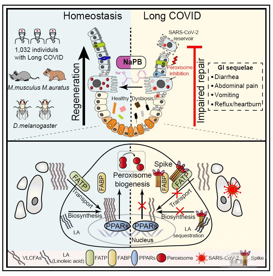两种已获FDA批准的药物——苯基丁酸钠(NaPB)和非诺贝特(Fenofibrate),不仅能够有效降低病毒感染载量,还可以通过恢复过氧化物酶体功能及促进肠道干细胞损伤修复过程,显著缓解小鼠和果蝇模型中的肠道后遗症症状。该研究不仅为肠道后遗症的病因提供了机制解释,也为当前缺乏有效治疗手段的临床实践提供了药物干预的新方向,提示过氧化物酶体可作为胃肠道后遗症潜在的治疗靶点。随着研究深入,针对代谢通路和干细胞修复能力的精准治疗策略,有望帮助数百万患者走出病痛阴影。