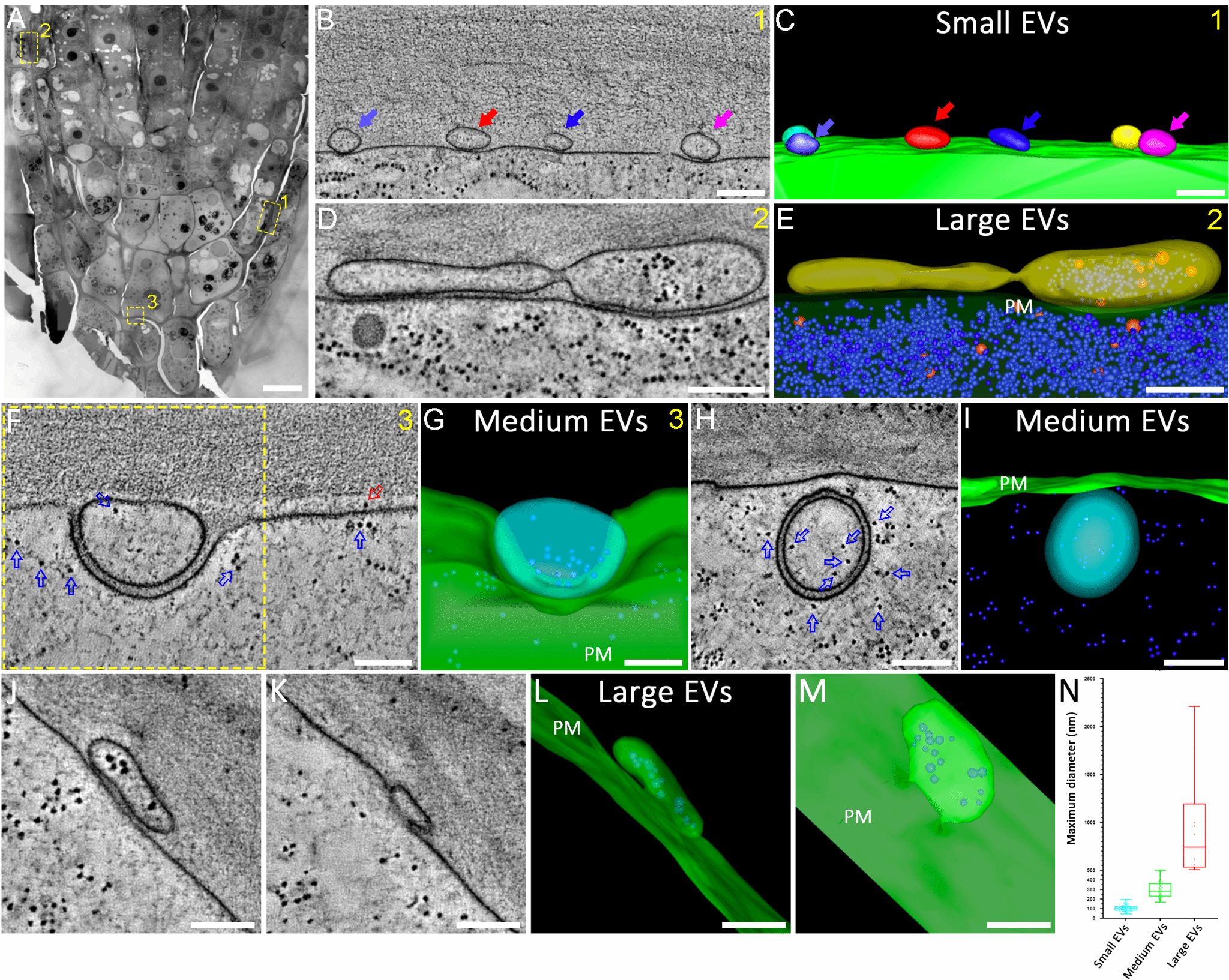 图1. 基于三维电子断层扫描技术对拟南芥根细胞中不同类型细胞外囊泡的结构特征鉴定。