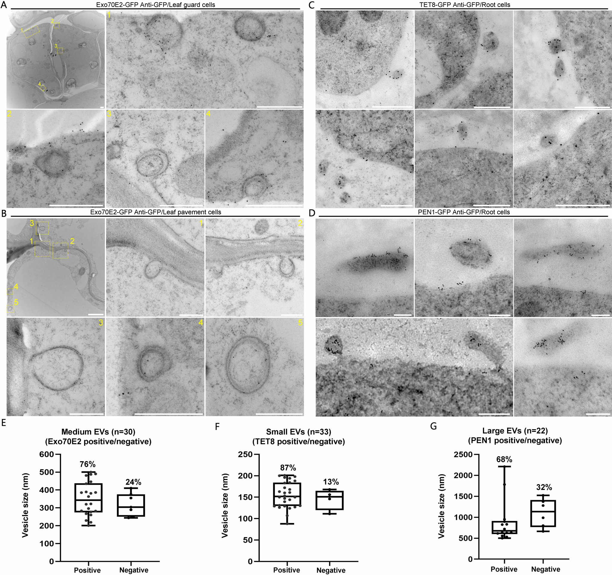 图3. 免疫金标记透射电子显微镜分析显示,由 Exo70E2、TET8 或 PEN1 标记的细胞外囊泡亚群呈现出各自独特的结构特征。