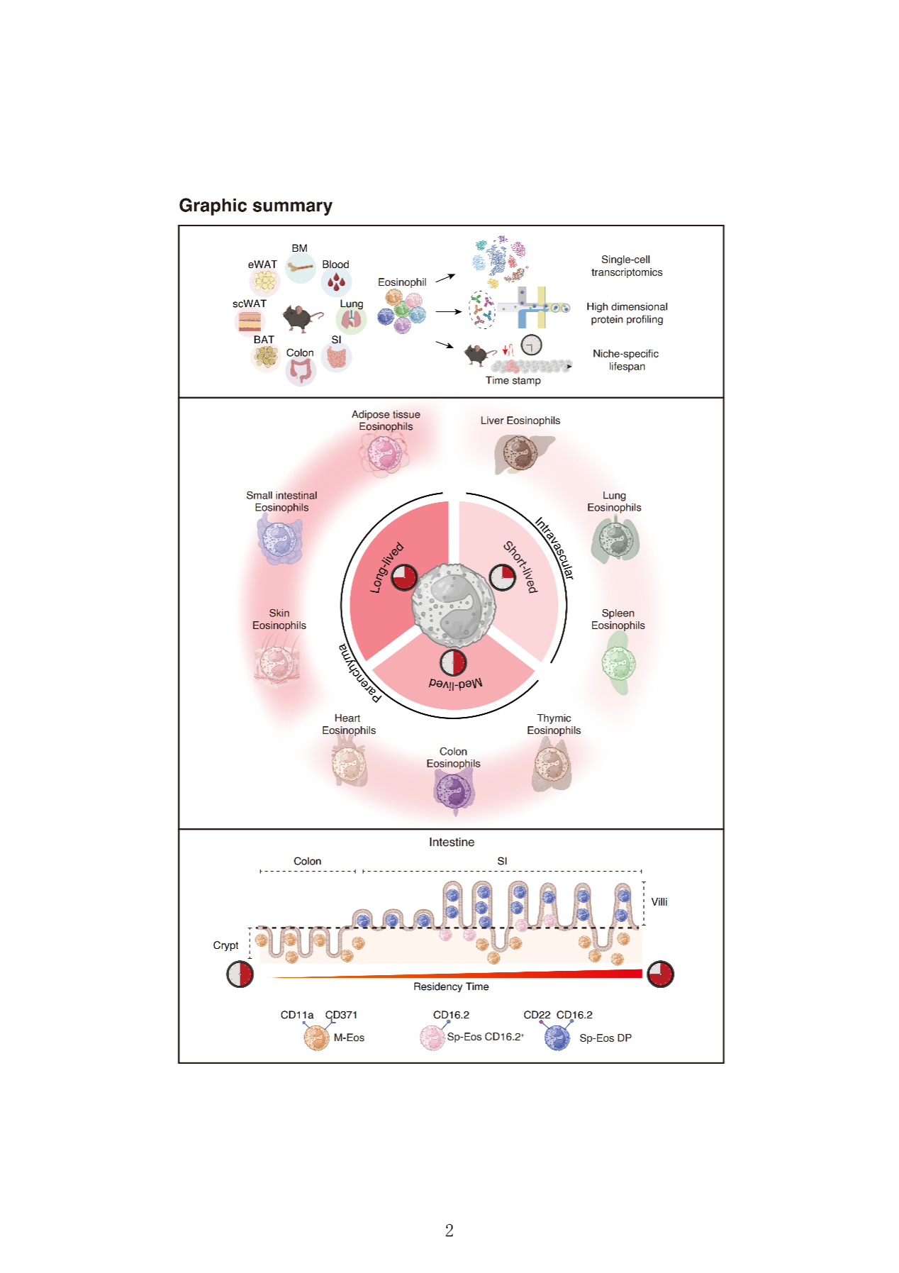 研究团队通过整合单细胞RNA测序、高维度表面蛋白组学和诱导性谱系示踪技术,系统描绘了嗜酸性粒细胞从骨髓前体、外周循环到组织定植的完整发育动态图谱。研究发现,组织驻留时间的延长促使嗜酸性粒细胞经历渐进式的功能特化,其异质性程度与细胞寿命呈显著正相关。短期驻留的嗜酸性粒细胞(短寿)维持相对均一的转录特征,而长期驻留的细胞(长寿)则表现出明显的层级化分子和表型特征。