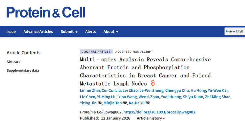 复旦大学附属肿瘤医院乳腺外科主任余科达教授领衔团队,与中国科学院上海药物研究所谭敏佳团队、复旦大学附属华山医院金贻婷团队,聚焦乳腺癌患者淋巴结转移机制的临床问题,通过跨学科团队联合攻关,于2026年1月12日,在国际权威期刊《Protein & Cell》上发表一项重磅研究成果,该研究通过多维度的分子分析,成功绘制出乳腺癌原发灶与转移至淋巴结的“分子地图”,标注癌细胞转移的“活动轨迹”,成功找到调控淋巴转移的关键“开关”,为乳腺癌的早期诊断和精准治疗提供了新靶点。