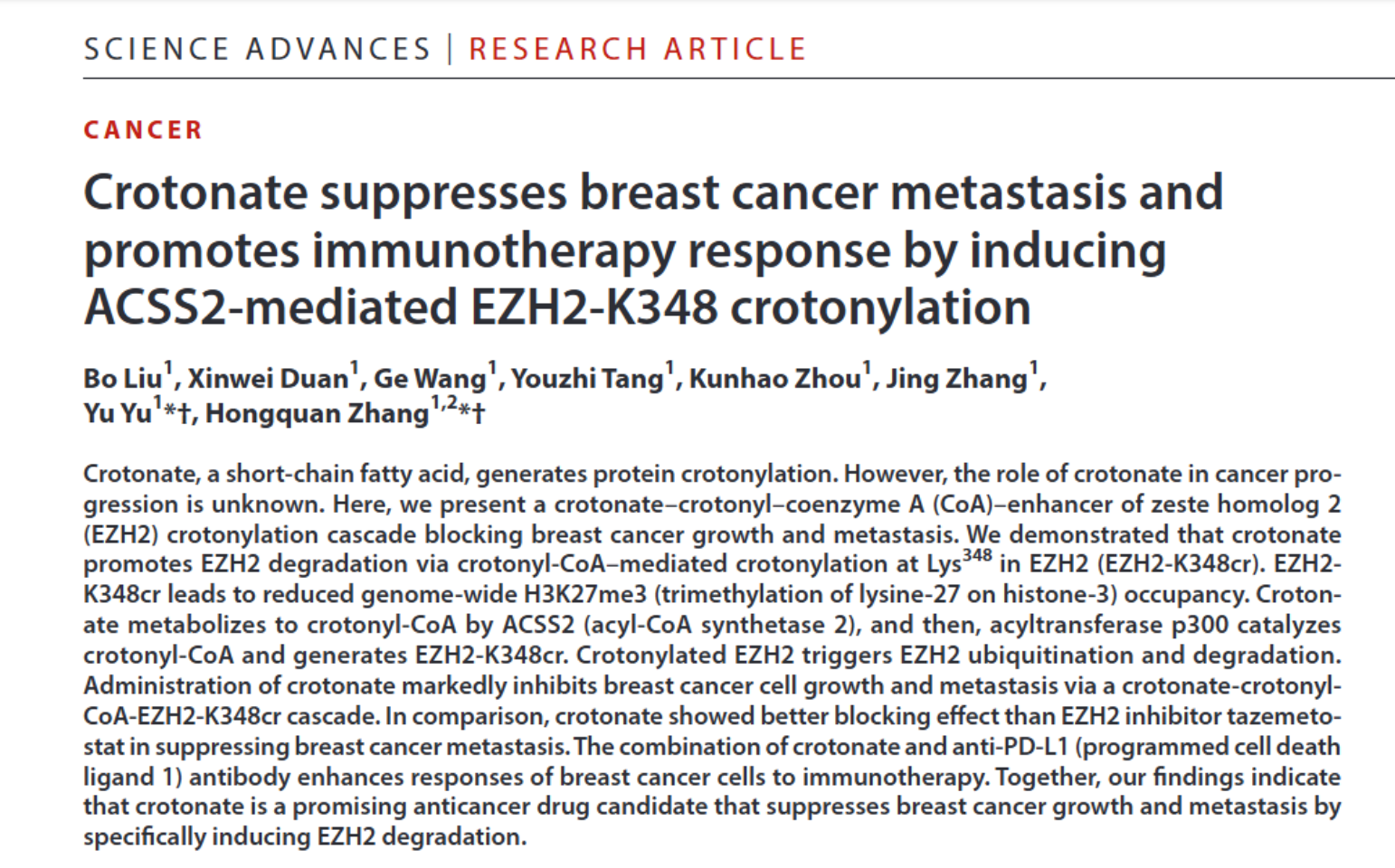 2026年1月16日,北京大学基础医学院、北京大学国际癌症研究院的张宏权教授领导的研究组在美国科学促进会旗下的综合期刊Science Advances 上在线发表了题为“Crotonate suppresses breast cancer metastasis and promotes immunotherapy response by inducing ACSS2-mediated EZH2-K348 crotonylation”的长篇研究论文,发现短链脂肪酸巴豆酸(crotonic acid或crotonate)通过ACSS2介导的致癌蛋白EZH2第348位赖氨酸(K348)的巴豆酰化修饰(crotonylation),导致EZH2的高效降解,从而抑制乳腺癌的生长和转移,同时巴豆酸也可以和肿瘤免疫检查点治疗协同,提高乳腺癌对免疫治疗的反应性