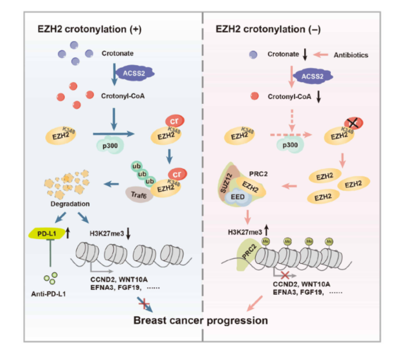 而在实体瘤细胞中以简单的方式整体降低EZH2蛋白质水平的治疗策略在近期被张宏权教授领导的研究组实现。历经10余年的潜心探索,该研究组筛选了调控乳腺癌细胞运动、迁移和转移的各种长度的脂肪酸,发现短链脂肪酸巴豆酸具有最明显的抑制肿瘤细胞运动迁移的能力。深入研究表明,巴豆酸必须转化成巴豆酰CoA才能发挥抑制肿瘤的作用。研究人员发现巴豆酸在体内经过ACSS2酶转化为巴豆酰辅酶A后,由p300酰基转移酶催化形成EZH2蛋白第348位赖氨酸的巴豆酰化修饰(EZH2-K348cr)。该修饰如同给EZH2贴上"降解标签",引发EZH2蛋白的泛素化降解,进而显著降低全基因组范围内的H3K27me3水平。引人惊奇的是,同样发生在EZH2-K348位点的修饰,乙酰化修饰和巴豆酰化修饰会产生截然相反的生物学功能和致病作用:一个稳定EZH2、促癌,一个趋使EZH2 不稳定、抑癌!令人振奋的是,在抑制乳腺癌转移方面,巴豆酸表现出比现有EZH2抑制剂他泽司他(Tazetomestat)更优异的阻断效果。研究人员还揭示出巴豆酸可以由肠道菌群产生,抗生素抑制肠道菌生长会降低肿瘤的巴豆酰化修饰水平,促进肿瘤的生长。另外,巴豆酸与肿瘤免疫检查点抑制剂抗PD-L1抗体联合使用,能够显著提升乳腺癌对免疫治疗的反应性,这为乳腺癌治疗开辟了新的途径。