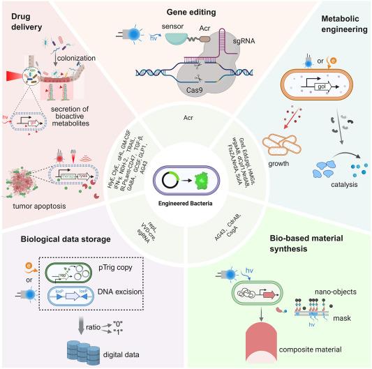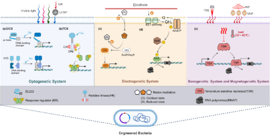 细菌基因表达调控在机制研究和实际应用中都至关重要。传统方法依赖化学诱导剂(如异丙基-β-D-硫代半乳糖苷(IPTG)、L-阿拉伯糖、L-鼠李糖、四环素等)控制特异性启动子,往往具有固有的局限性,包括时空特异性差、不可逆激活、有限的信号正交性和潜在的细胞毒性,这限制了其在复杂生物系统中的应用。光遗传学、电遗传学、声遗传学、磁遗传学系统等新型细菌基因远程调控手段有效地克服了化学诱导剂的固有局限,为扩大细菌在尖端生物技术中的应用场景开辟了新途径。