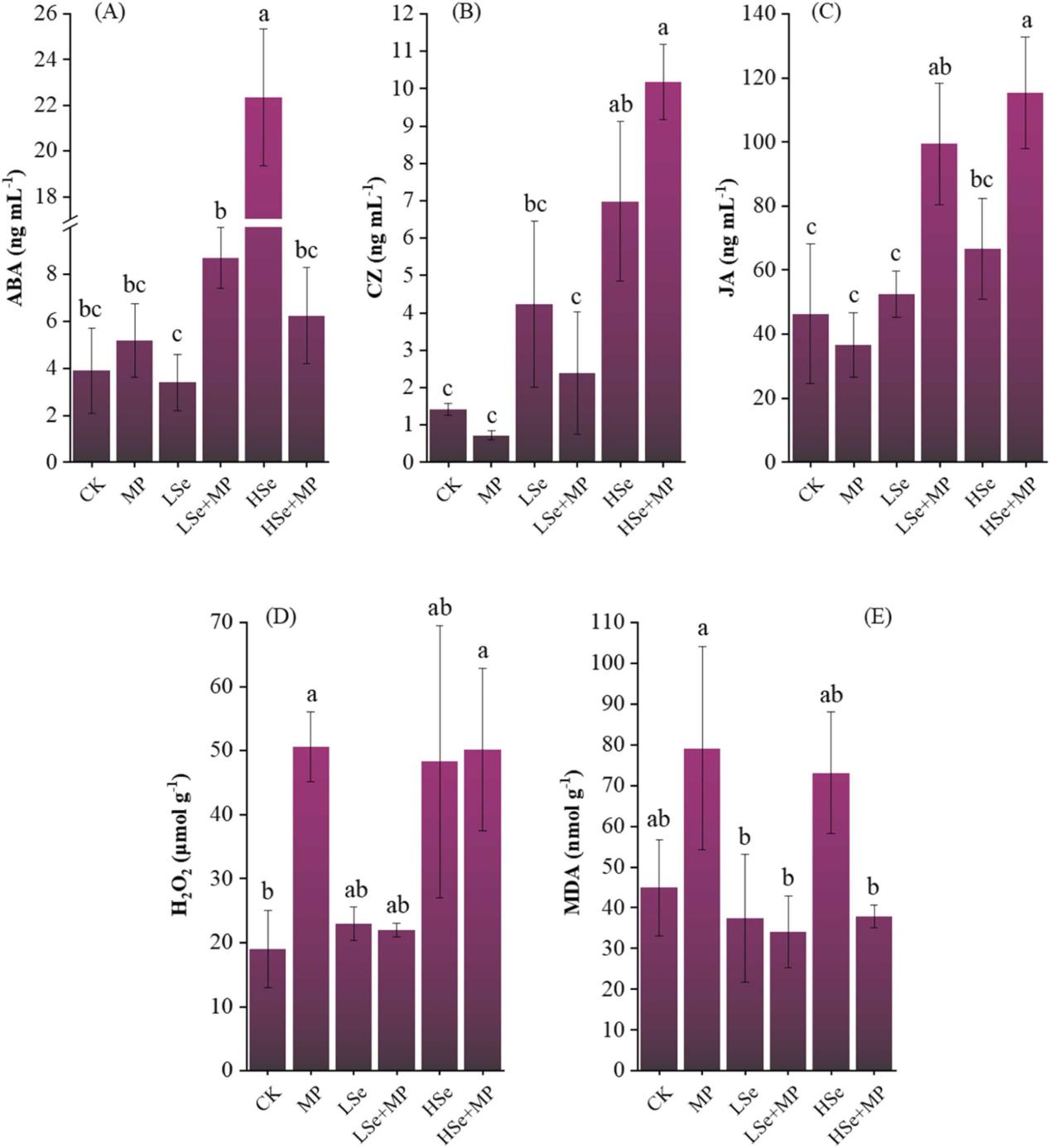 图2?MP和Se处理对植物激素及氧化应激标志物的影响