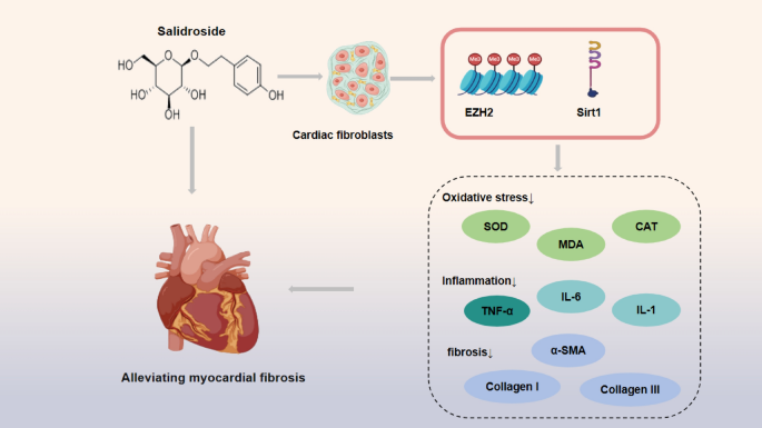心肌纤维化治疗中Salidroside通过SIRT1/EZH2信号通路抑制Ang II诱导的纤维化,提升抗氧化酶活性并减少炎症因子,动物模型验证其有效性。