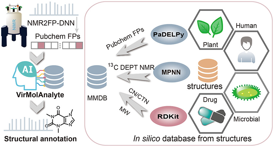 核磁共振(NMR)是天然产物结构鉴定中最重要的分析工具之一。然而,NMR?谱图的结构注释通常高度依赖成本高昂的实验数据。尽管近年来基于量子化学计算或者人工智能算法生成的虚拟NMR数据在一定程度上扩展了数据库规模,但基于虚拟数据库的结构注释准确率仍然有限。为解决这一问题,研究团队近期提出了一种新的工具?VirMolAnalyte(https://www.virmolanalyte.top/),可在无实验数据依赖下,实现对?13C DEPT NMR?谱图的高质量结构注释。