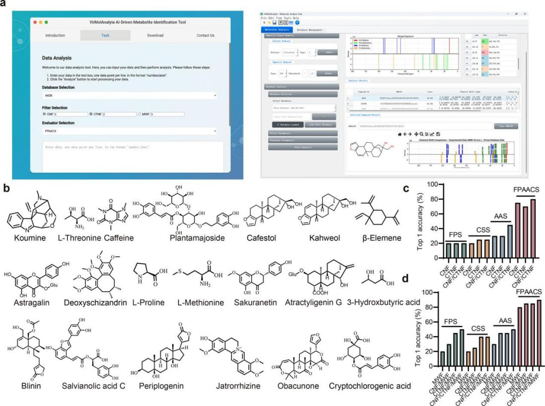 VirMolAnalyte?利用深度神经网络从?13C DEPT NMR?谱中提取分子指纹信息,并结合“筛选–评估”(filter–evaluator)策略开展多维?in silico?数据库检索。其核心思想在于改进了基于化学位移匹配的搜索算法,同时将基于深度神经网络预测的分子指纹信息融合到化学位移检索过程中,从而显著提升基于虚拟数据库的准确率。在DB6123数据集上的评估结果表明,该融合策略的Top 1准确率达到?94.2%,明显优于传统的化学位移搜索方法。