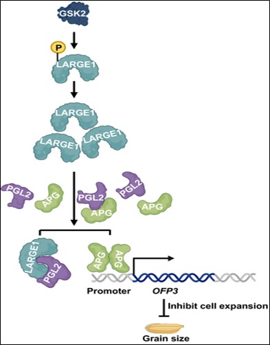 GSK2-LARGE1-PGL2/APG通路调控水稻籽粒大小和粒重的工作模型
