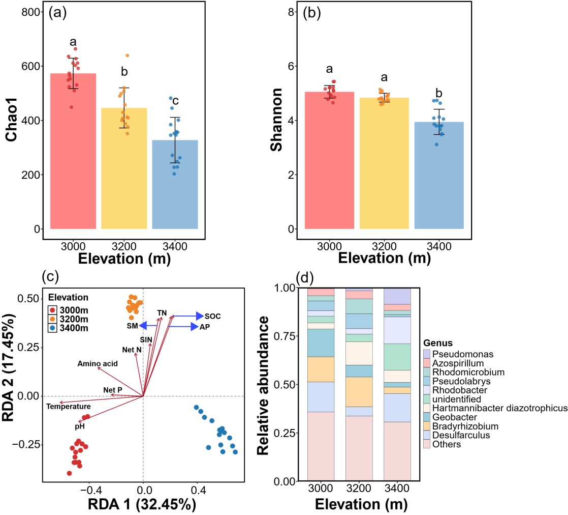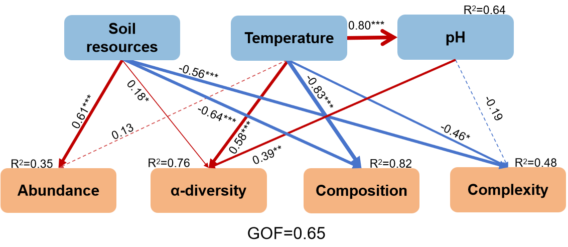 基于此,中国科学院成都生物研究所尹华军团队针对四川卧龙岷江冷杉林(Abies faxoniana)海拔梯度,探究了固氮微生物群落结构及功能随海拔的分布格局与调控机制。研究结果表明:Ⅰ. 固氮微生物群落结构沿海拔梯度发生显著变化;其中,慢生根瘤菌属(Bradyrhizobium)相对丰度高,且在不同海拔共现网络中均表现为关键类群,对维持亚高山森林土壤固氮微生物群落稳定尤为重要。Ⅱ. 固氮微生物丰度主要受土壤资源有效性调控,而其α多样性、组成和共现网络复杂性则同时受温度和土壤性质影响;值得注意的是,相比总细菌群落,固氮微生物α多样性对温度变化更为敏感且呈显著正相关,表明未来气候变暖可提升亚高山森林土壤固氮微生物多样性。Ⅲ. 此外,固氮微生物群落结构与RNA层面固氮潜能之间缺乏显著关联,反映出高寒环境中固氮微生物结构与功能关系的复杂性。以上结果表明,亚高山森林固氮微生物群落结构对环境变化的高度敏感性,未来需在更广泛区域同步监测固氮微生物群落结构与固氮速率,以深化对亚高山森林生态系统氮循环过程的理解。