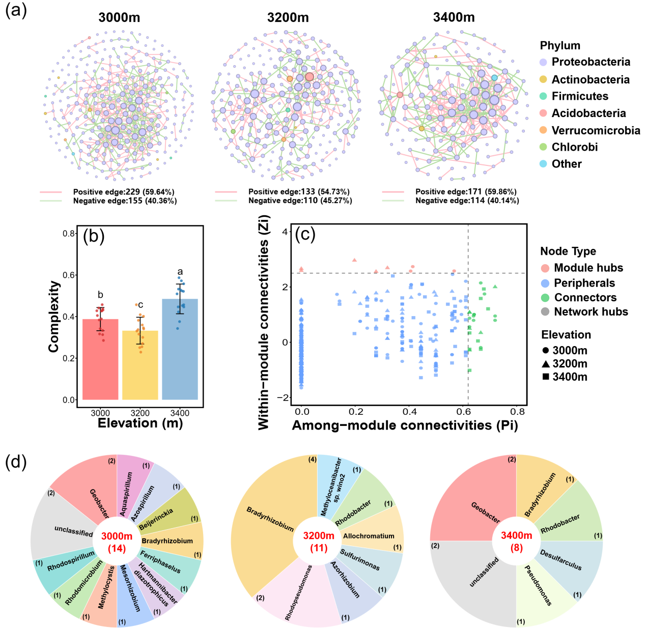 Fig. 3?亚高山针叶林不同海拔土壤固氮微生物群落的共现网络与关键物种
