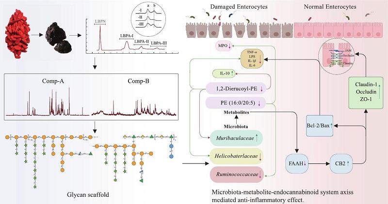 在慢性束缚压力诱导的小鼠肠道炎症模型中,活性最优的果胶组分(LBPA-III,100 mg/kg.bw)可显著减轻结肠组织损伤,恢复细胞因子平衡(如TNF-α水平降低、白介素IL-10水平升高),并抑制中性粒细胞浸润。机制层面,LBPA-III通过重塑肠道菌群结构(如降低Helicobacteraceae丰度、升高Muribaculaceae丰度)、下调促炎脂质代谢物(如1,2-dierucoyl-PE)水平,以及调控内源性大麻素系统(如CB2水平升高、FAAH水平降低)发挥抗炎作用。上述研究揭示,枸杞果胶AG-II与RG-I–AG-II这种独特的结构范式,通过“超分子伪降解”机制协同调控肠道菌群,并激活“肠道菌群-代谢物-内源性大麻素系统”轴,从而高效抑制肠道炎症。