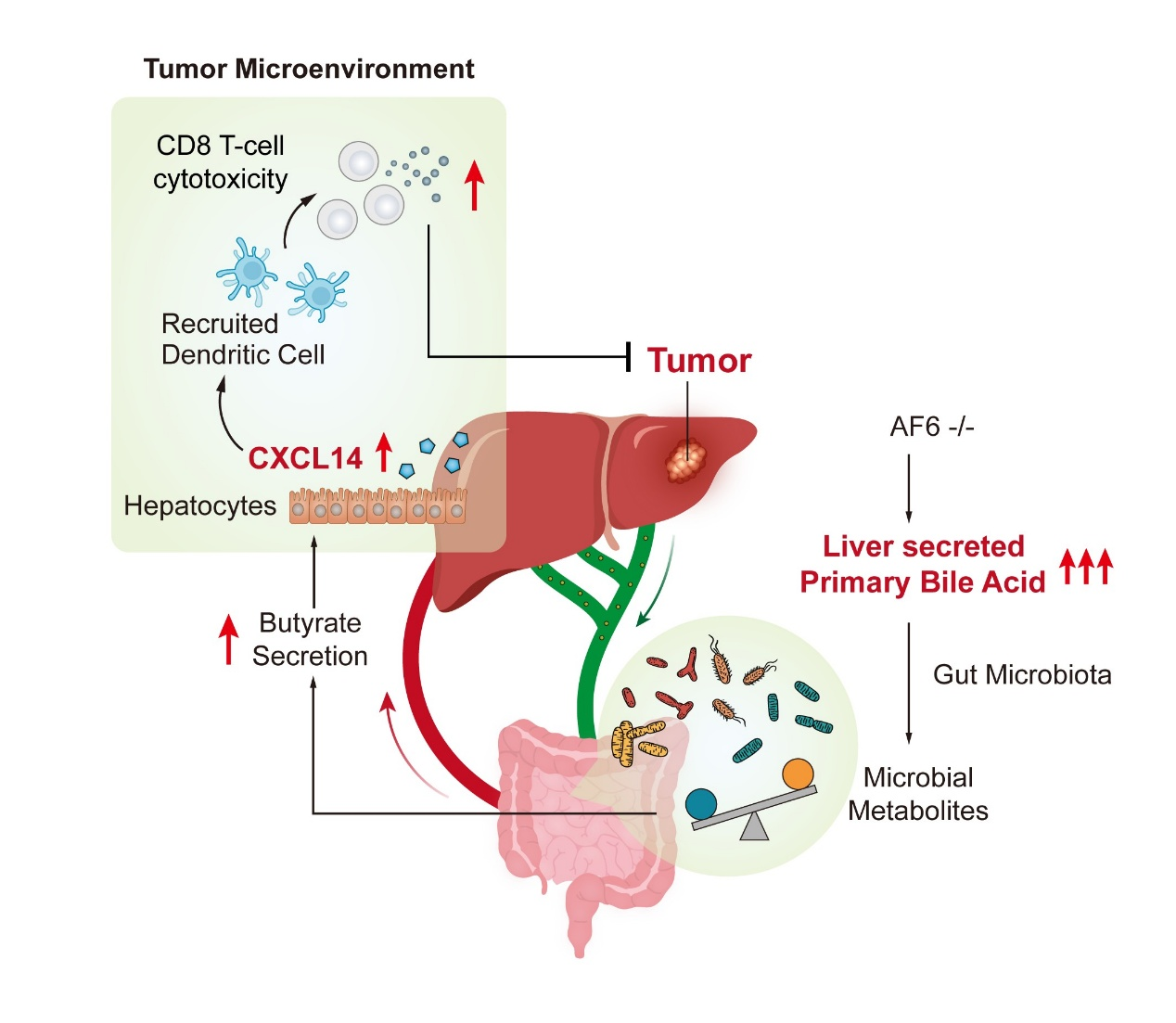 图:肝脏AF6 诱导胆汁酸代谢-免疫作用轴增强肝癌抗肿瘤免疫的机制示意图