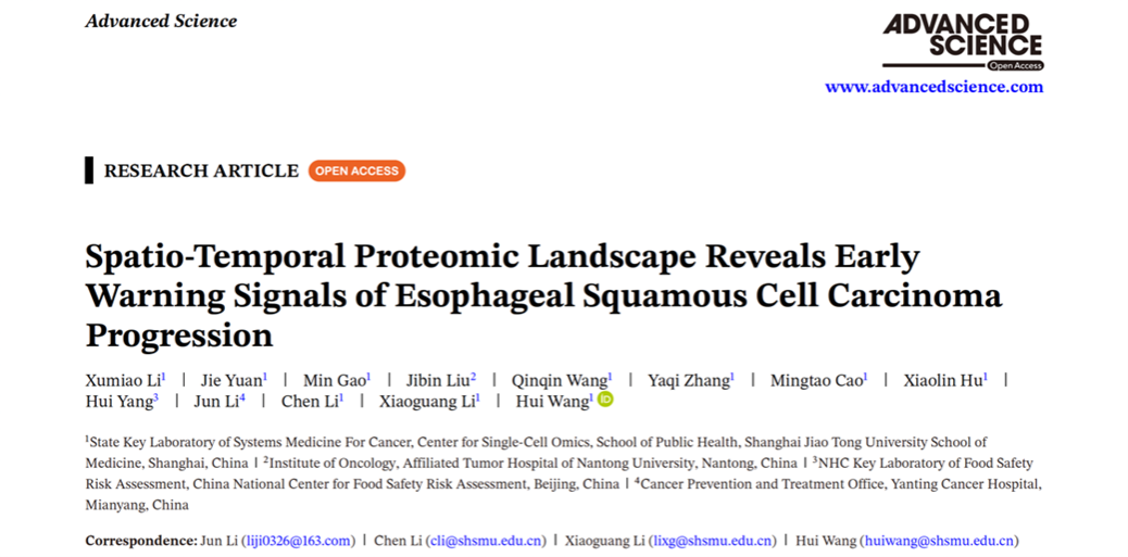 近日,上海交通大学公共卫生学院/单细胞组学与疾病研究中心王慧/李晓光/李辰团队合作在国际知名综合性期刊Advanced Science在线发表了题为“Spatio-Temporal Proteomic Landscape Reveals Early Warning Signals of Esophageal Squamous Cell Carcinoma Progression”的研究论文