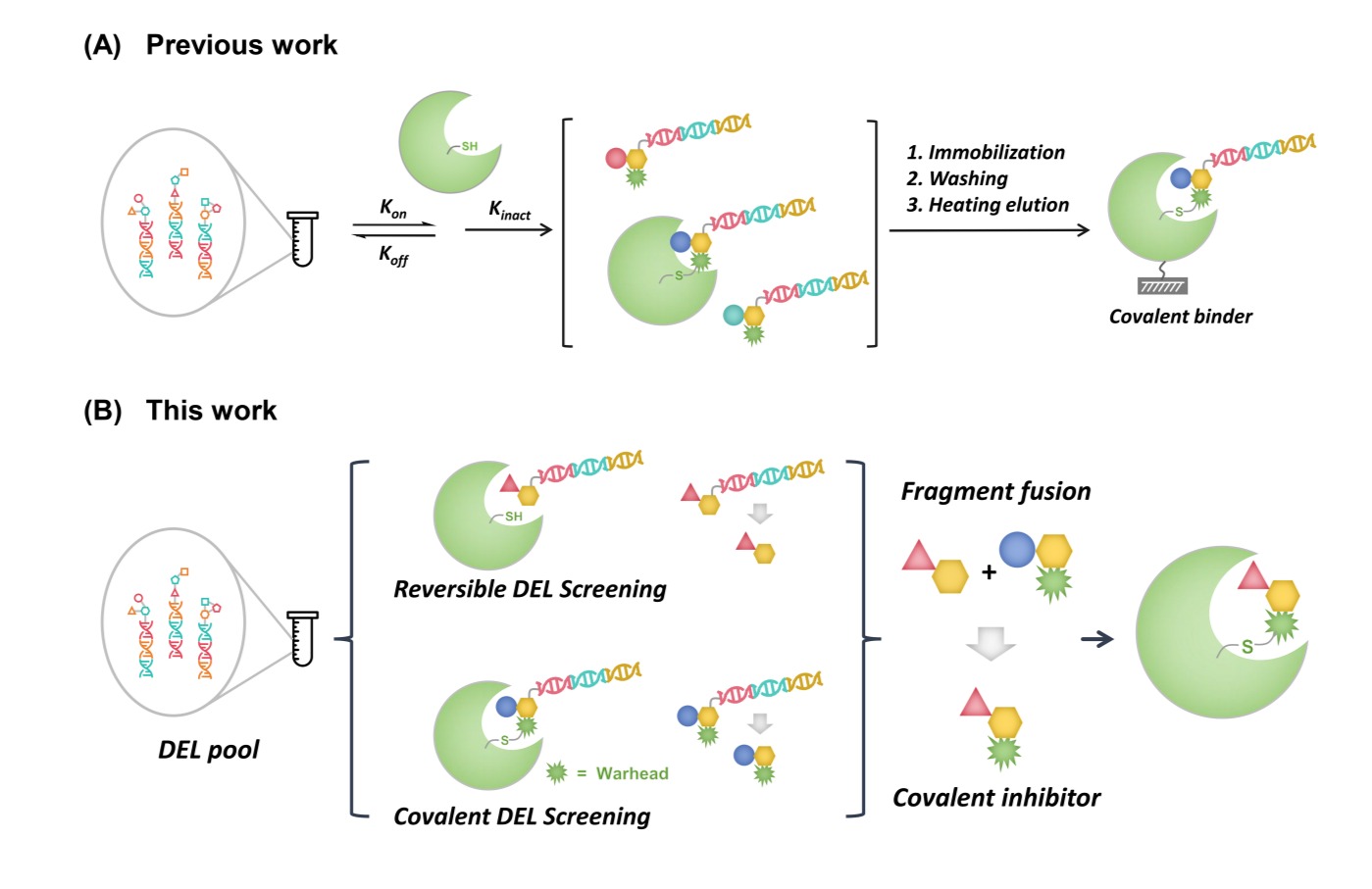 变构抑制剂因具有高选择性和不易引发耐药等优势,是应对传统药物结合位点平坦、易突变等挑战的理想策略。然而,变构位点难以预测,且缺乏高效的筛选手段。同时,共价靶向策略通过与特定氨基酸残基形成共价键,能显著增强抑制剂效力和作用持久性,其应用范围已从半胱氨酸拓展至更多氨基酸类型。本研究巧妙地将变构抑制与共价靶向概念相结合,并利用DNA编码化合物库技术实现了高效发现。研究团队开发并合成了多类DEL与CoDEL库。CoDEL技术具备快速合成数亿级别共价化合物的能力,是整合亲电弹头并进行特定残基靶向筛选的理想平台。