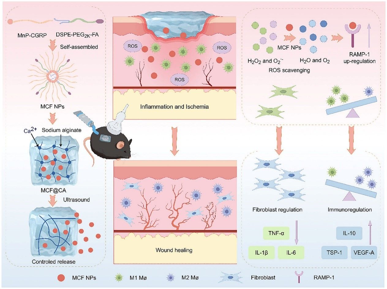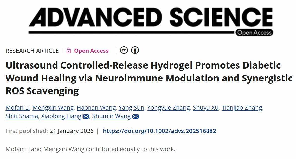 近日,北京大学第三医院超声医学科王淑敏教授、梁晓龙研究员团队在《先进科学》(Advanced Science)上发表了题为《超声控释水凝胶通过神经-免疫调控协同活性氧清除促进糖尿病创面愈合》(“Ultrasound Controlled-Release Hydrogel Promotes Diabetic Wound Healing via Neuroimmune Modulation and Synergistic ROS Scavenging”)的研究论文。该研究构建了一种超声响应型水凝胶递送系统MCF@CA,为糖尿病创面治疗提供了新策略。