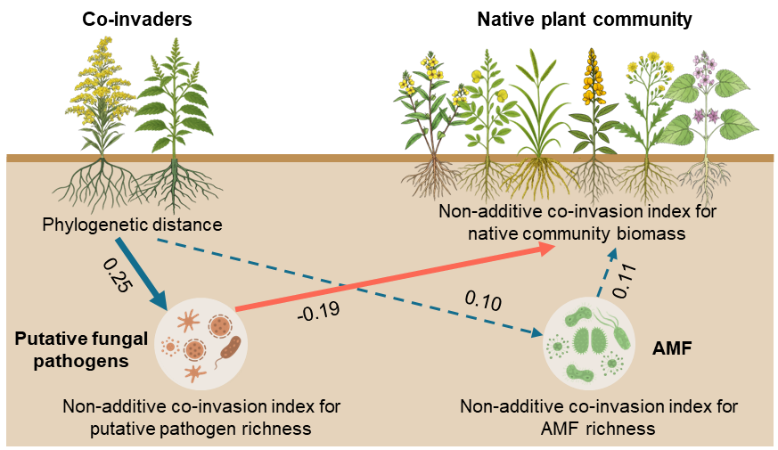 中国科学院武汉植物园入侵生态学研究团队以重大入侵植物加拿大一枝黄花为主要研究对象,选取了16种在野外常与其共同出现的外来植物作为共入侵伴生种,通过温室控制实验与野外实地调查相结合的方式,系统揭示了多物种共入侵对本地植物群落的非加性效应及其土壤微生物驱动机制。研究发现,多数共入侵组合对本地植物群落表现出显著的负面非加性效应,呈现典型的“入侵崩溃”特征。尤为重要的是,该非加性效应表现出强烈的系统发育相关性:与加拿大一枝黄花亲缘关系越远的共入侵物种,在共同入侵时对本地植物群落的抑制作用越强。进一步分析表明,这种非加性效应主要由土壤病原菌的协同积累所驱动。系统发育距离较远的共入侵植物组合,能诱导土壤中病原菌多样性显著增加,而这种病原菌的非加性富集与本地植物群落的负面非加性效应显著相关。该研究从系统发育相关性和土壤微生物互作的角度,揭示了“共入侵植物系统发育距离—土壤病原菌协同积累—本地植物群落非加性效应”之间的内在联系,拓展了“入侵崩溃”假说的理论内涵。研究成果为预测多物种共入侵的生态后果提供了新的理论框架,也为针对性入侵治理与生态恢复策略的制定提供了科学依据。